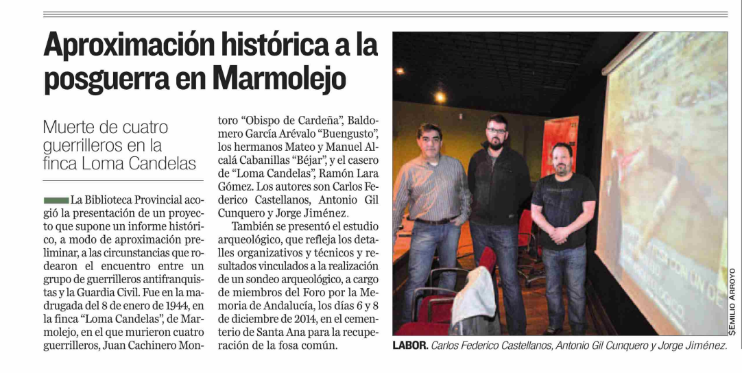 En este trabajo se entrecruza la arqueología, la documentación histórica depositada en archivos, la memoria oral como fuente narrativa, y una obra autobiográfica de primer nivel para comprender la inmediata posguerra en esta localidad, las memoria de Emiliano Rodríguez Garrote (1982), «Odisea de un antifascista en la España de Franco», como testigo directo de aquél terror caliente de la primavera al otoño de 1939.